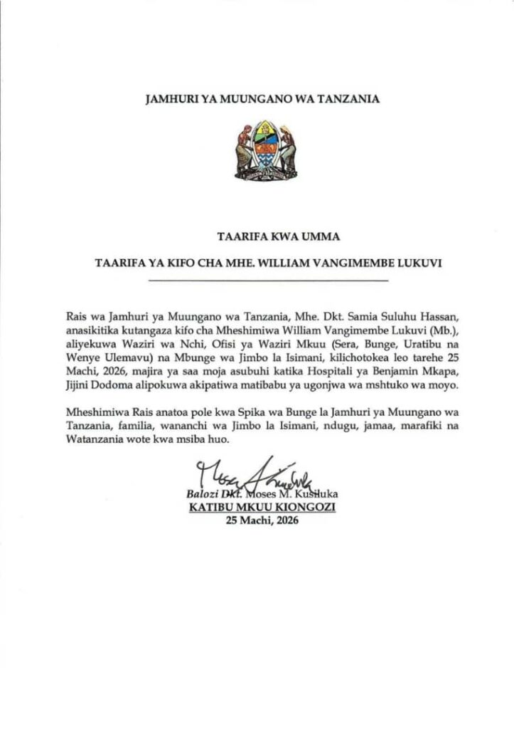 Serikali ya Jamhuri ya Muungano wa Tanzania imetangaza kwa masikitiko kifo cha Mbunge wa Jimbo la Isimani na Waziri wa Nchi, Ofisi ya Waziri Mkuu (Sera, Bunge, Uratibu na Wenye Ulemavu), William Vangimembe Lukuvi, kilichotokea leo Machi 25, 2026, majira ya saa moja asubuhi katika Hospitali ya Benjamin Mkapa, alipokuwa akipatiwa matibabu kufuatia mshtuko wa moyo.